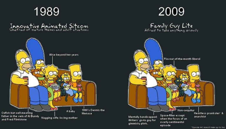 I don’t think there is anyone in this world that watched the inception, peak and descent of The Simpsons that wouldn’t agree that the shark was jumped around about the time Homer started becoming a barely functional idiot. Not just regular dumb but supremely stupid and almost stripped of all humane characteristics till we get to the place where we are now and people wonder “Whats the point?“. And yet, it lurches on.