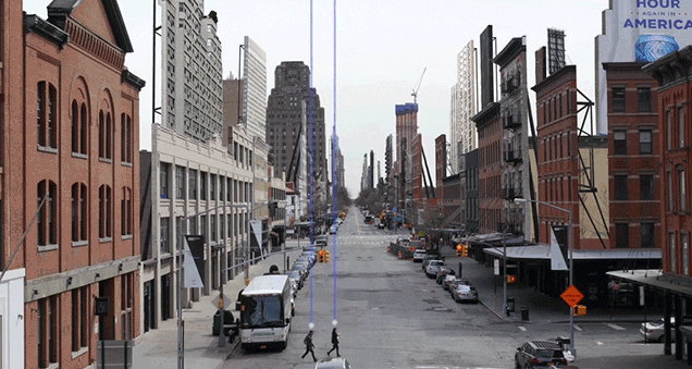 He sits down, on the pavement, under a street lamp in this urban environment and takes in the details. Time passes and he notices more and more things. Like how the cars keep recycling and the drunk driver keeps on making circuits and yet the policeman walking never seems to notice that he is pantomiming taking a sip from the brown bagged bottle he raises to his lips. The dog walker too keeps going round and round and the people that left one office building walked out of it again. And again. Eventually you hear “Cut!” in the distance and everyone stops what they were doing.