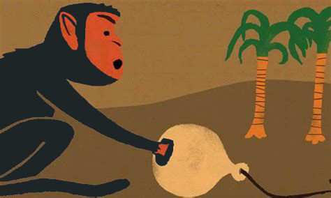 A hunter rests on the plains, looking for a way to trace some running water to ease his dryness when he spots some baboons running around and thinks “Time for one of my old tricks” as its far less effort. See, he knows they like salt almost as much as life itself so he fashions a trap where its placed within so the baboon can grip it but can’t extract his fist when gripped. What do you think happens when he sees the hunter coming? Thats right he’s paralyzed with indecision because to let go means losing that which brings him so much joy with its crystalline gleam soon to pump around his blood stream, whilst the presence of man the causes ramping anxiety due to the threat which means he’s in quite a quandary. The hunter grabs him easily, locks him up and gives him as much salt as he wishes and waits till the thirst kicks in. Its at this point he lets him go and follows him to the spring and they both drink their fill.