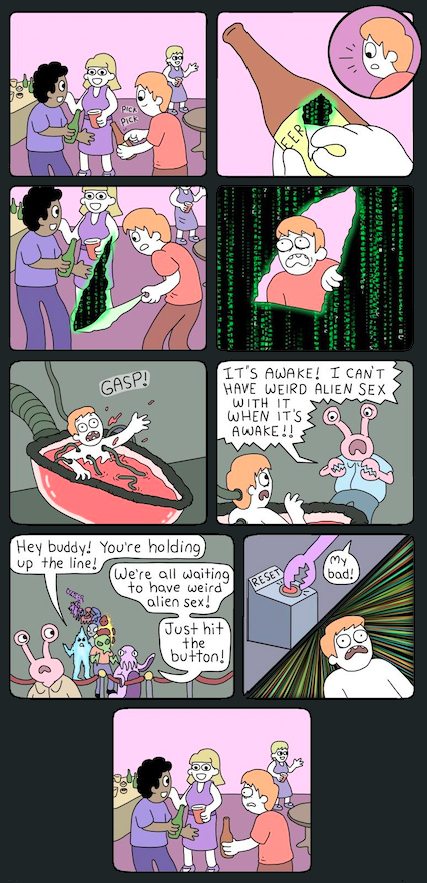 “Thing is they don’t give one single solitary F about the weird alien space sex that can only happen when you’re plugged in and distracted. Why would they? They’re too busy having fun at a party and socializing and your frame of reference – or Reality Tunnel – is totally different to what they accept as common sense and thus not worth examining”.