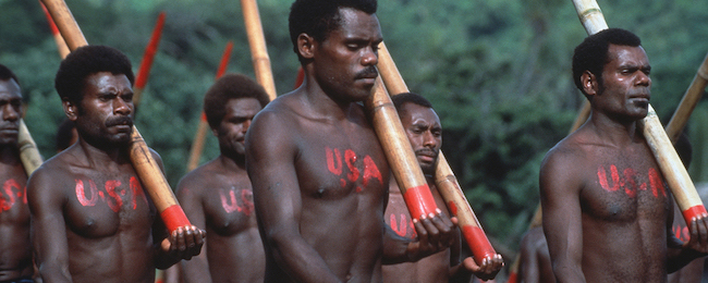 A few dozen men are gathered, their chests daubed in red with three letters they reference as symbols of benevolence that left an imprint upon their collective consciousness. With trousers covering their legs and not much else they wave their bamboo sticks which have also been painted as they exchange greetings as they engage in merriment. A distinguished gent wearing a jacket that looks worn and oversized makes his entrance and the natives look solemn as he yells at them. With intense purposefulness the men get into formation and begin marching through the jungles to the peak where a clearance awaits them. What happens next defies logical explanation but, from their frame of reference, makes perfect sense: