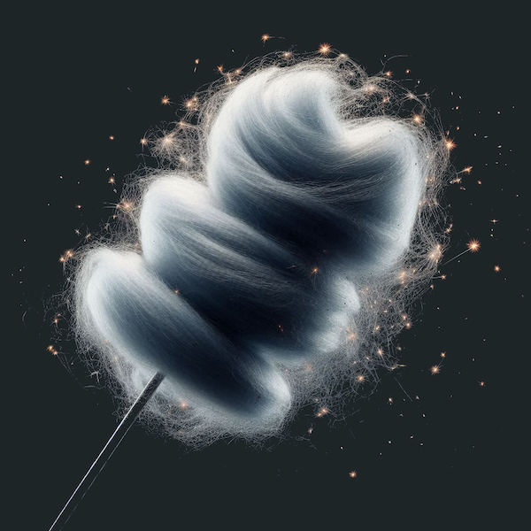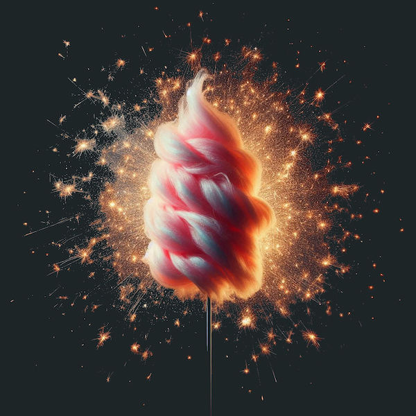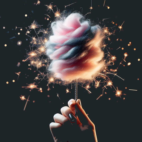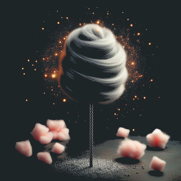 “Forget the rest, I can’t get over this. I mean, stop and think, we’ve got this stick in the mid, a central column, which is the peak of design and engineering as each one is perfect and that means that someone must have created it. I mean trees don’t grow in forests like this, do they? I wonder why they did it? Then look at the floss. The biggest and best select the finest specimens to get it in and you can see the trends hop from one gen to the next. Does that mean that style is immortal and its surfing above our world in a realm unseen? Can you see where I’m going with this? Are there levels on top of levels and we, as the most basic form of candyfloss sentience are missing the big pic because of… what, I’m wondering? Is it intentional? A design flaw? Or is the fact that I can ponder such things all the testament you need of the inherent greatness that created a situation in which one can be both of an in, in the same instance, and thus render vastly differing perceptions to the rest via the virtue of their attention and how they direct it?”.