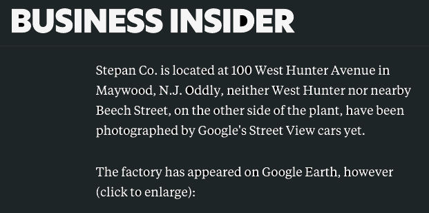 Thats to scale, by the weigh. Not a typo. Look at the ingredients and note they mention an ambiguous “natural extract” on the list. Thats the leaf, sans sniff, as processed by the Stepan Company, NJ who take the reup and flip to Mallinckrodt who chop, chop the rock and sell to the doc, dentists and anyone else who needs a hit of the sniff. For legit purposes, of course. But that doesn’t stop one who does the Knowledge questioning why the company located at One Hundred West Hunter Ave, NJ was only recently added to Street View and even then a large portion is still off the record when everything else around it was sketched, well, way back when: