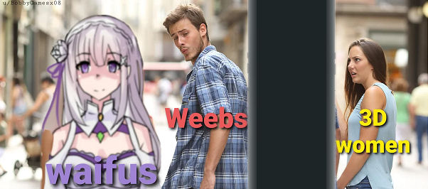 In researching this topic I found an artsy pic that was a pretty amazing rep of ones fantasy realm. It featured said Weeb, in all his nerddom, surrounded by a whole bunch of adoring anime women that were reaching out to him. They repped all different types of style and I found it very interesting because what it said (to my awareness) about him was: