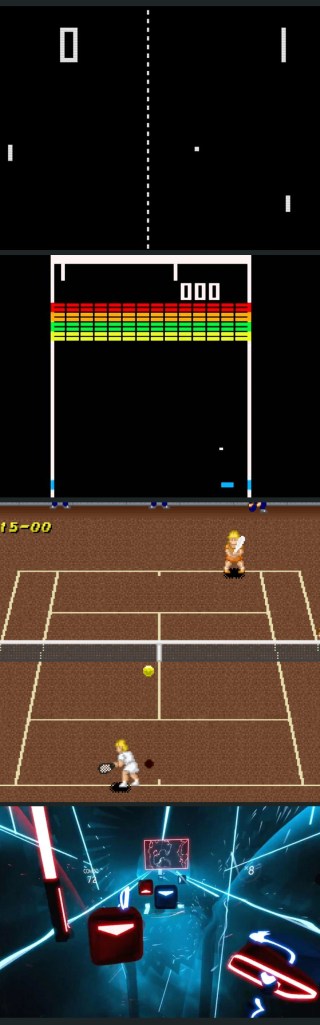 A great way to comprehend this is imaging you start off playing a Game with a full hologram overlay that taps directly into your senses and thus is totally indistinguishable from the main realm because when you’re plugged in its as real as it gets. You level up and progress and the resolution dips as you’re now wearing the VR tech we currently possess via a headset and controller mitts to approximate the imperience. Once again, the same thing kicks and now you’re playing from a couch with an immense screen in front via Sixth generation consoles and the commensurate lowering in effects etc etc. Soon you’re sitting in a bedroom with a small Fourteen inch screen and enjoying Sixteen bit excellence with friends before we’re back in the days of Pong and its true innovation.